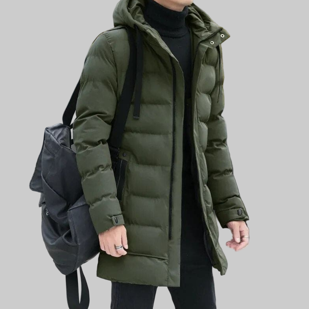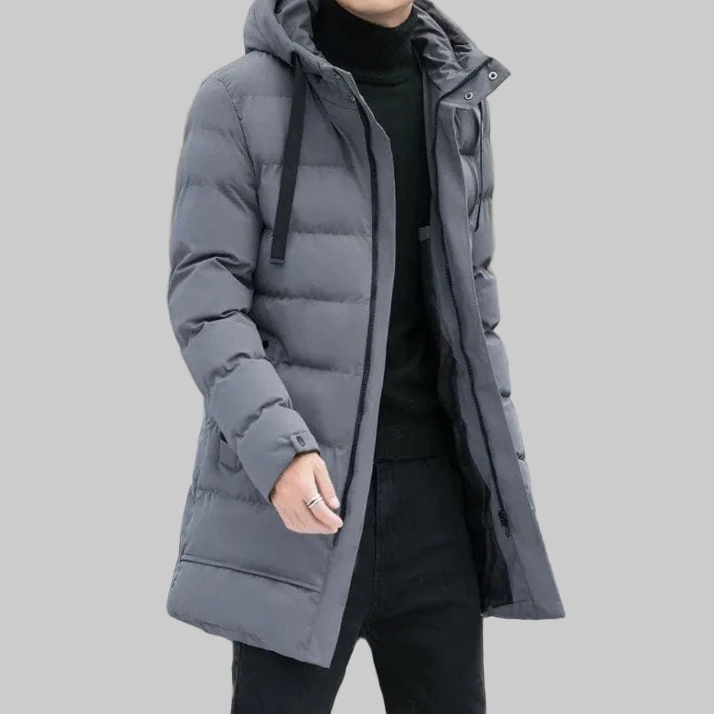 This is a long hooded coat with a quilted look, featuring two side pockets with zippers. The hood has a drawstring to adjust its size and two buttons to keep it securely in place on the head.