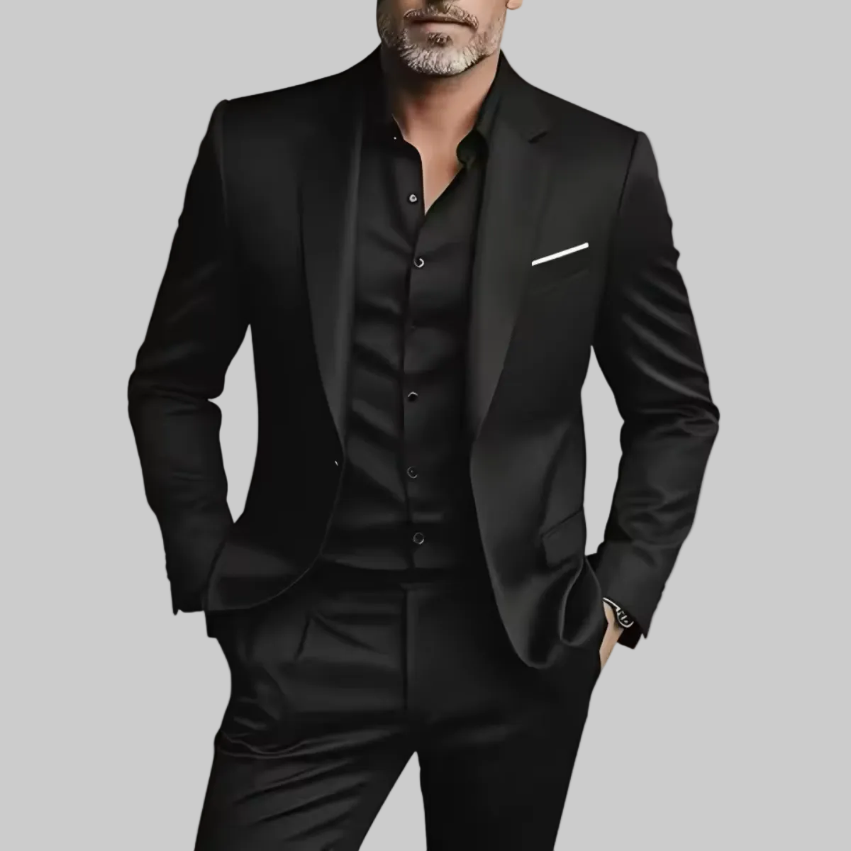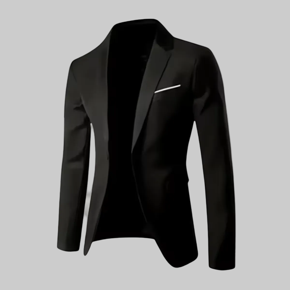 A notch lapel blazer that has a one-button closure and slightly slanted pockets with a single chest pocket, the trousers have a flat front style with a hook and eye closure