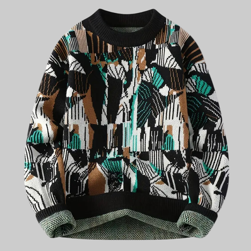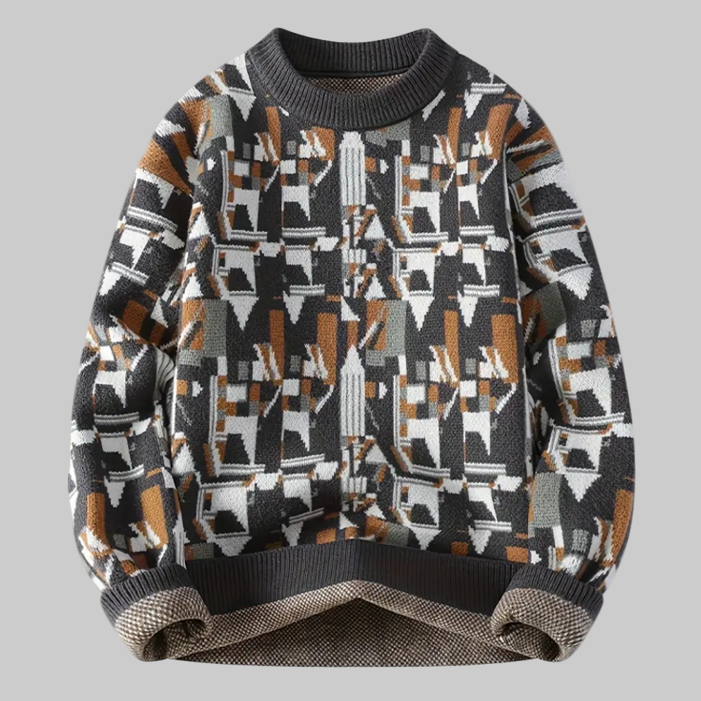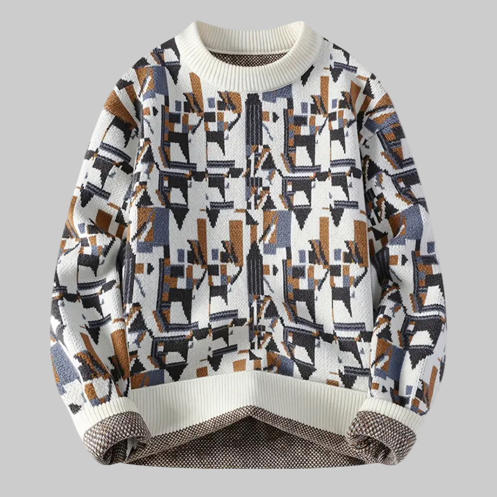 This men's sweater features a geometric pattern evenly distributed across the entire garment. It has a simple round neckline and long sleeves with straight cuffs. The cut is straight and falls to the hips. The overall lines are regular and symmetrical, defined by the continuity of the pattern across the body and sleeves.
