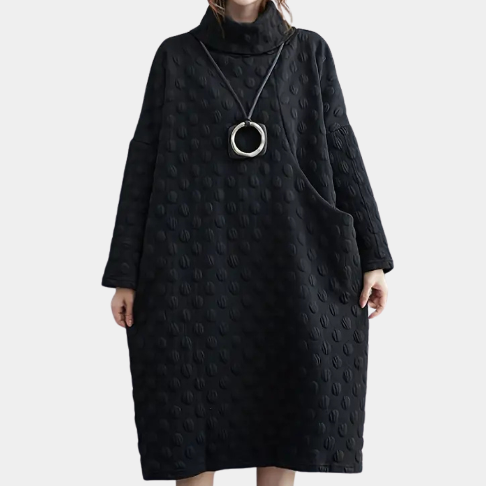 This women's dress features a high neck and a polka dot pattern evenly distributed across the garment. The cut is straight and slightly loose, creating an oversized effect, and falls to the knees. The sleeves are long with simple cuffs. The dress has two side pockets integrated at the hips.