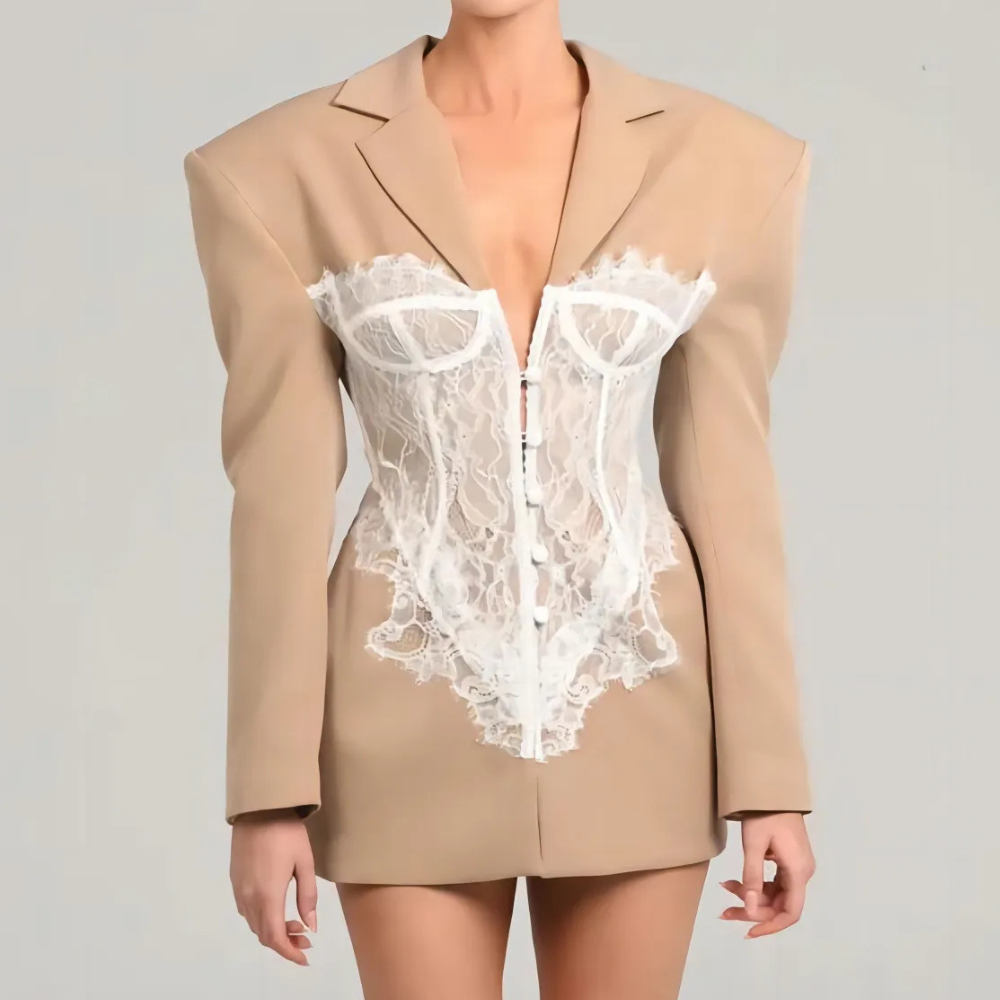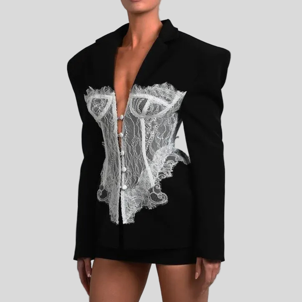 This women's blazer jacket has a structured cut with a classic lapel collar and button closure at the front. It features an integrated lace corset panel at the waist, which contrasts with the main fabric of the blazer. The long sleeves end in a straight hem, and visible seams at the shoulders, sides, and waist reinforce the construction of the piece.