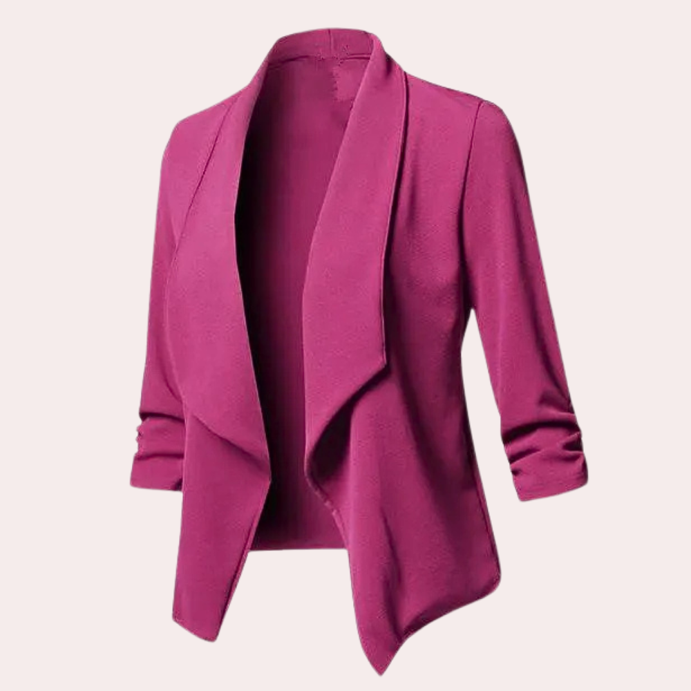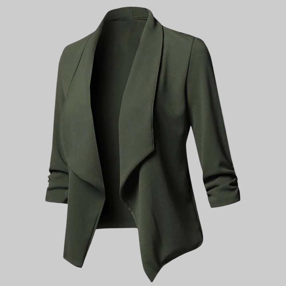 This women's blazer features a draped cut with an open front, 3/4 sleeves, and a relaxed silhouette. Its asymmetrical hem adds a modern touch, making it a versatile piece for your everyday outfits.