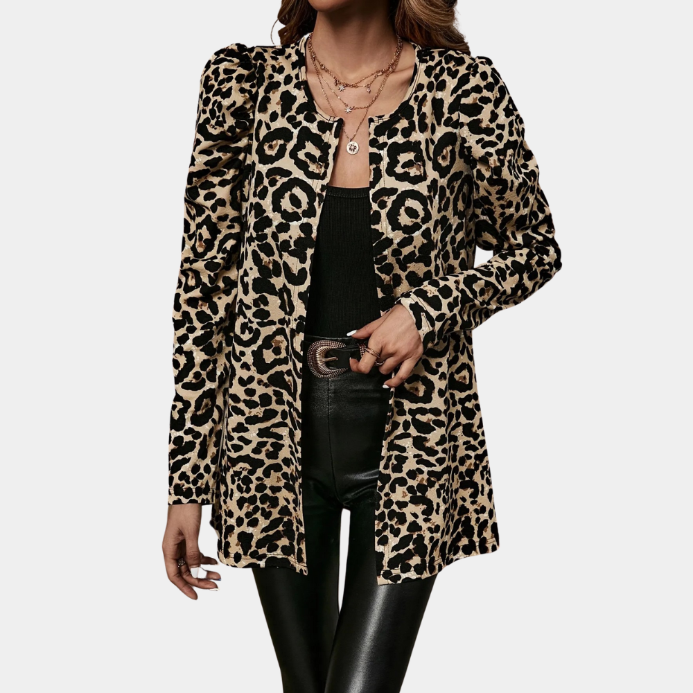 This women's jacket features a leopard print covering the entire garment. It has no fastenings or buttons, offering a simple opening at the front. The sleeves are long with simple cuffs, and the cut is straight, falling slightly below the waist. The overall lines are regular and symmetrical, with a silhouette defined by the shape of the body and sleeves.