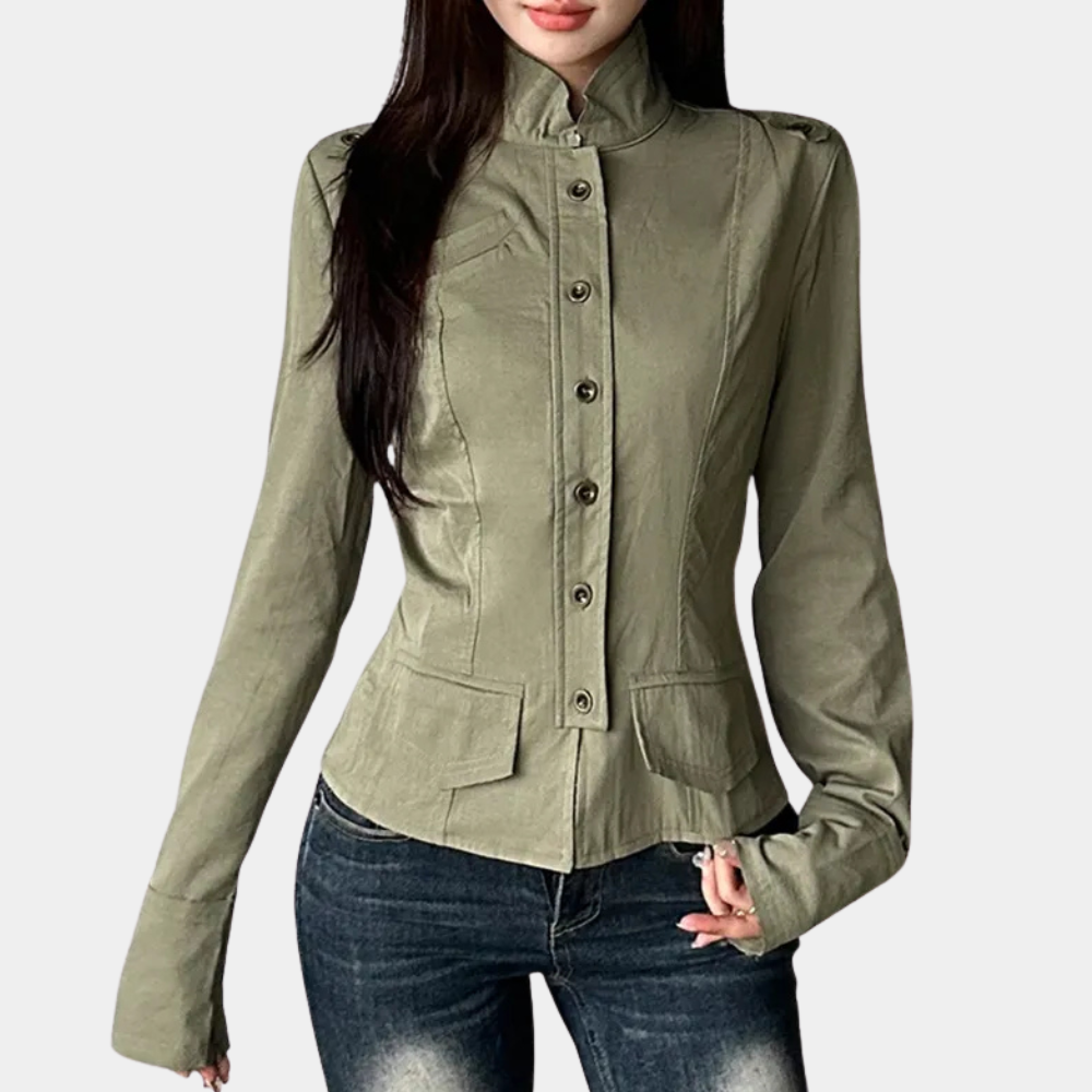 This women's jacket features a stand-up collar and a front zipper closure extending from the neckline to the hem. It has several zippered pockets on the front, integrated into the structure of the garment. The sleeves are long, with simple cuffs, and the hem is straight. The surface of the jacket has a uniform appearance, with seams along the shoulders and sides.