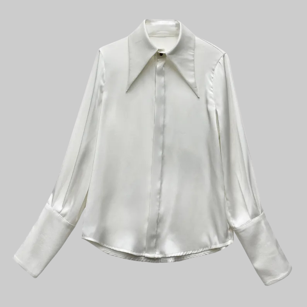 This women's shirt has a straight cut with a large collar that falls low on the chest. It fastens with a series of buttons arranged evenly down the front, extending to the bottom hem. The sleeves are long with simple cuffs, and there are visible seams along the shoulders and sides.