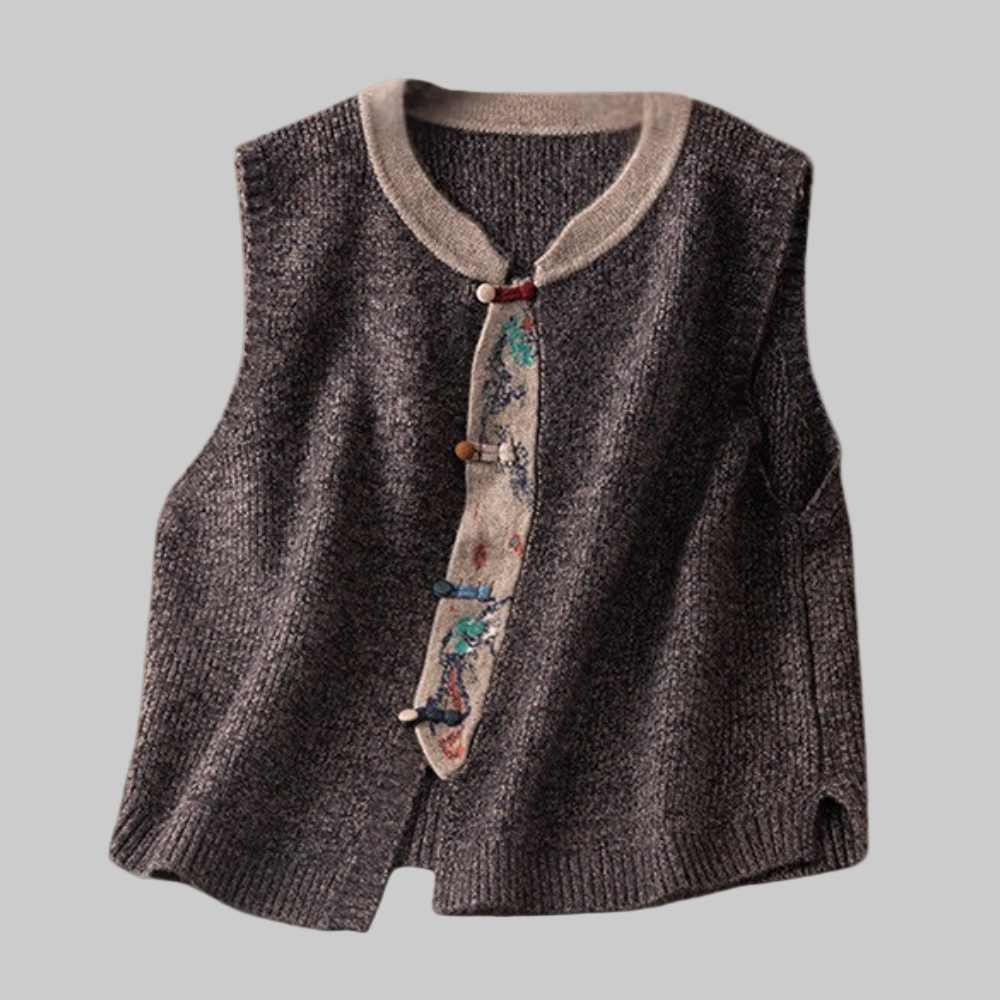 This women's sleeveless sweater is made from a regular knit and features a straight, mid-length cut. The neckline is V-shaped, structured by a knitted border that follows the line of the collar. The front has a series of buttons placed vertically from the top to the hem, allowing the garment to be opened or closed completely. The armholes are wide and without sleeve finishes, revealing a relaxed fit on the shoulders.
