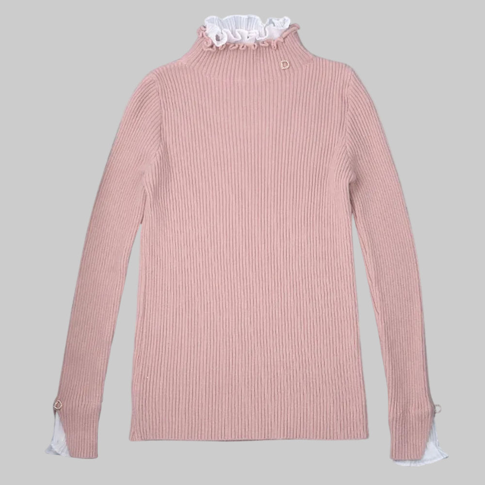 This long-sleeved ribbed knit top features a high neck with a white ruffled trim that extends beyond the neckline, creating a layered effect. The same white ruffled detail extends below the cuffs, giving continuity to the design. Subtle metallic accents in the form of small decorative clasps are placed at the neckline and on one sleeve near the cuff. The top has a straight hem that falls to the hips, while the overall fit is fitted and close to the body. The ribbed texture is vertical, adding structure and a clean, linear look.